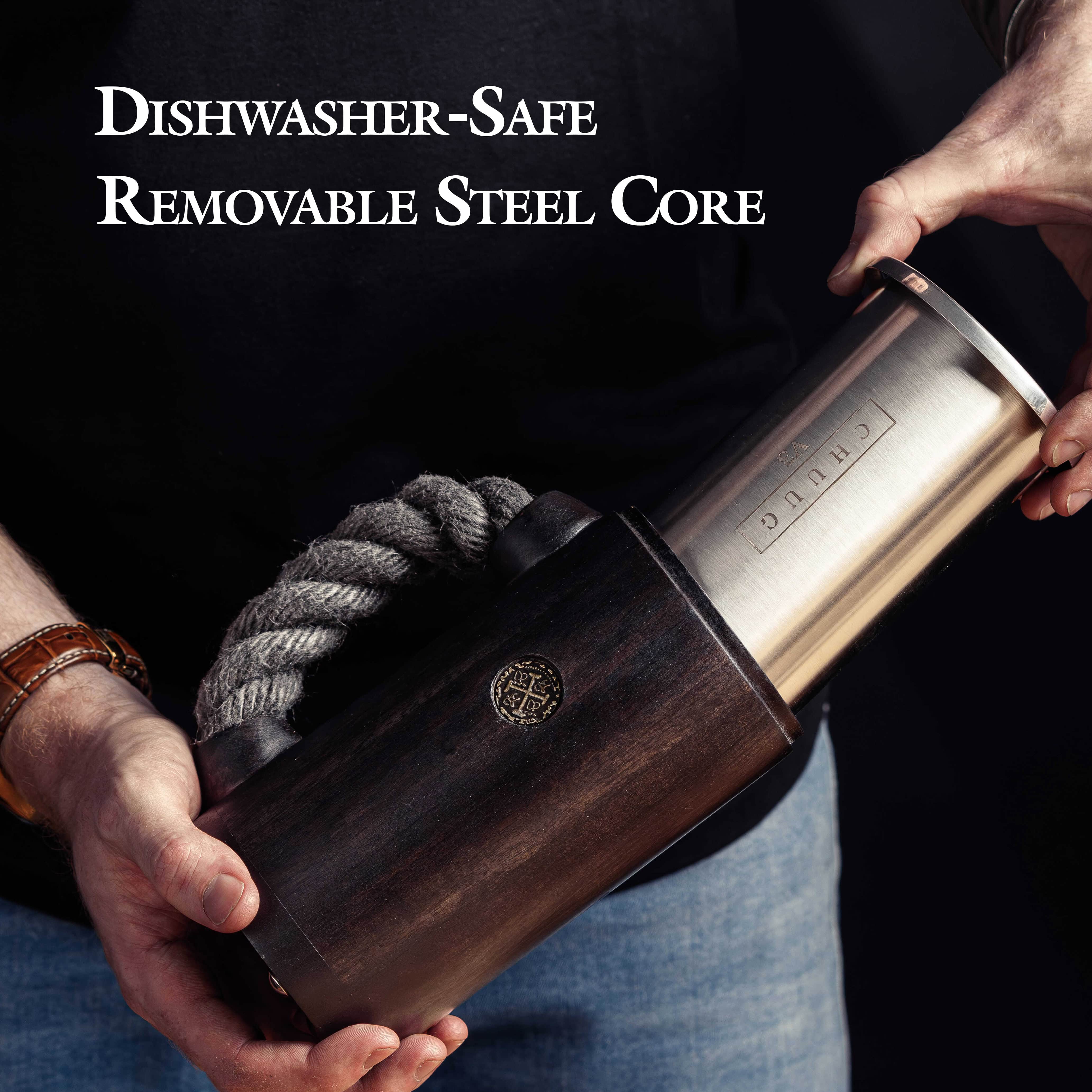 Hand wash the exterior wood and SmartRope handle. Unscrew the inner metal core and wash how you like! This part is dishwasher-safe. The wood might like an occasional rub with food-grade mineral oil to keep it looking sharp.